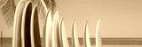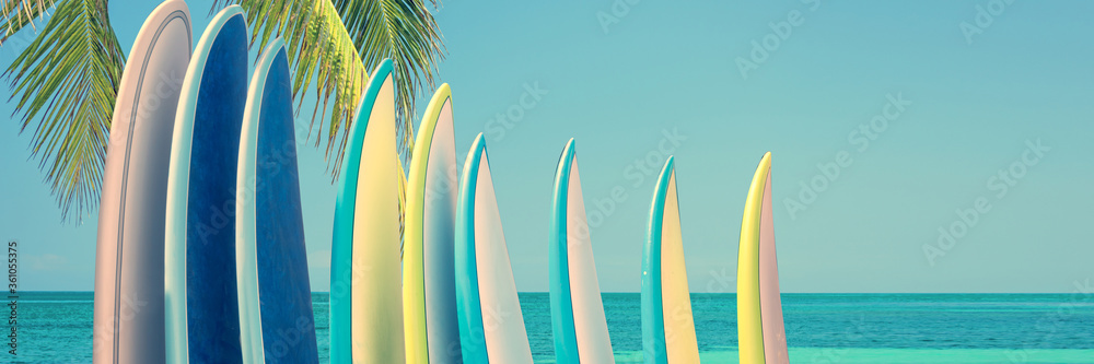 Panorama of vintage colorful surfboards on a tropical beach by the ocean with palm tree