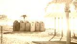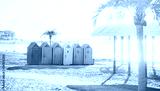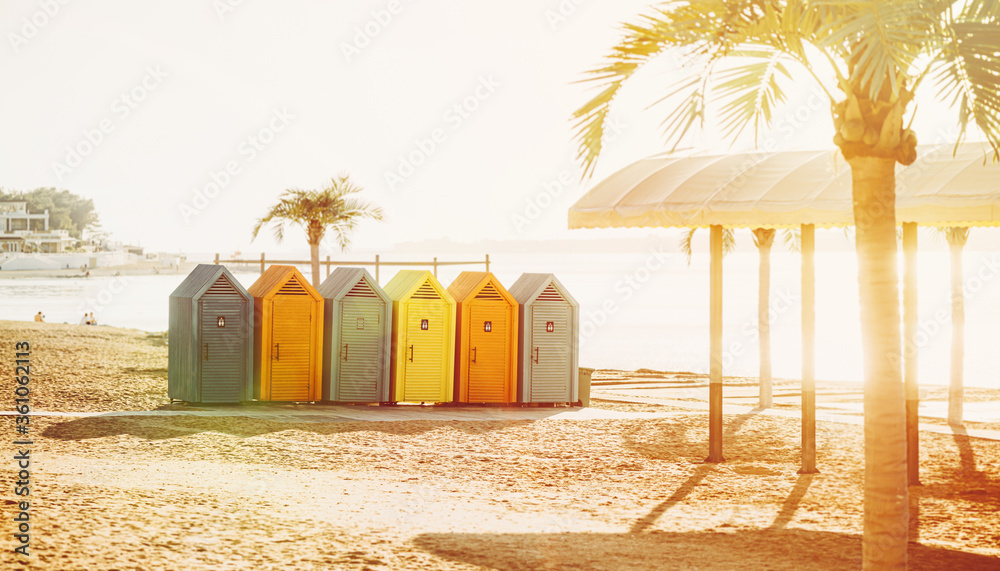 Colorful locker rooms on beach in summer sunny day. Resort city Gelendzhik.
