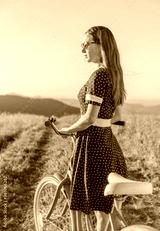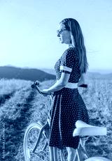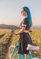 Beautiful girl with blue hair standing with bicycle in summer meadow.