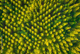Aerial top view of summer green and yellow pine trees in forest in rural.