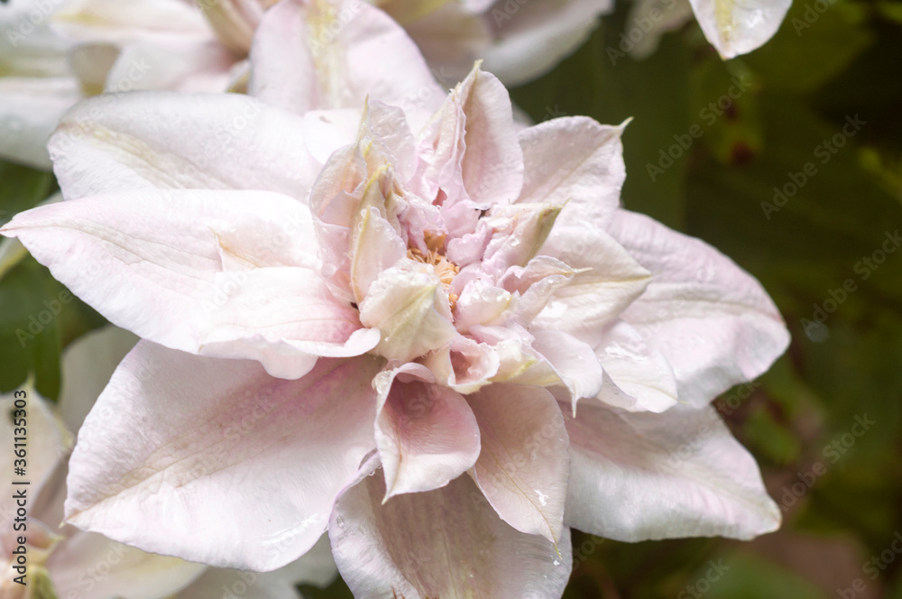 Soft pink clematis Innocent Blush with raindrops on the petals. The flowers in the garden, backgrounds, close-up.