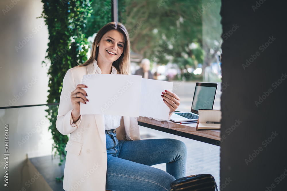 Cheerful woman with blank paper at modern workplace