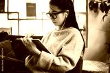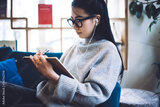 Pensive asian creative writer in spectacles for vision correction and earphones making notes in notepad while learning, serious hipster girl designer drawing sketch and listening music via accessory