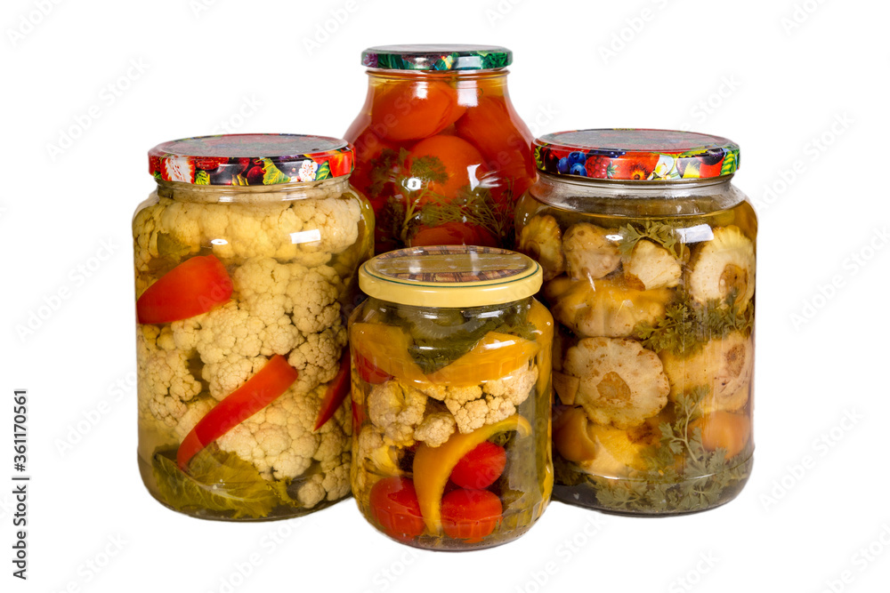 Preserved vegetables on white background. Homemade blanks.