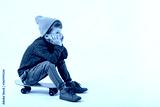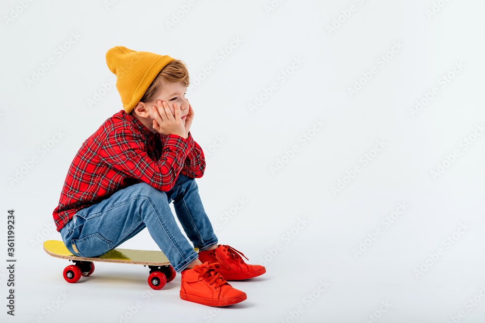 tired little boy is sitting on a skateboard, dressed in red shirt with squares and jeans, isolated on white background, studio shot