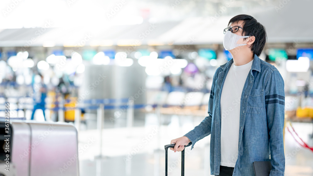 Asian man tourist wearing face mask carrying suitcase luggage at check-in counter in airport terminal. Coronavirus (COVID-19) pandemic prevention when travel. Health awareness and social distancing