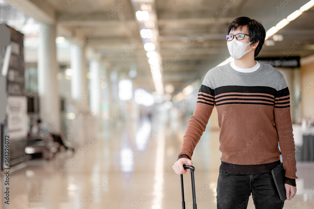 Asian man tourist wearing face mask carrying suitcase luggage waiting for check-in in airport terminal. Coronavirus (COVID-19) pandemic prevention when travel. Health awareness and social distancing
