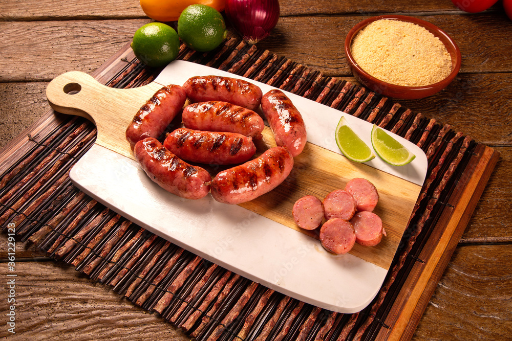 Fresh grilled Pepperoni sausage. Grilled Pepperoni Sausage on wooden board.