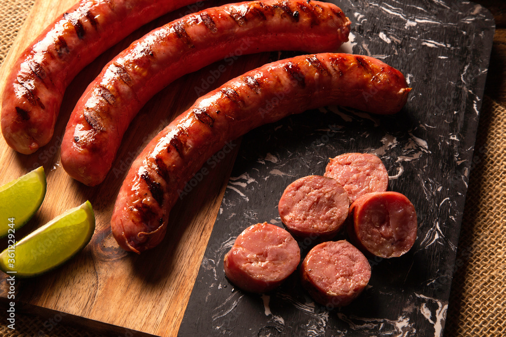 Fresh grilled Pepperoni sausage. Grilled Pepperoni Sausage on wooden board.