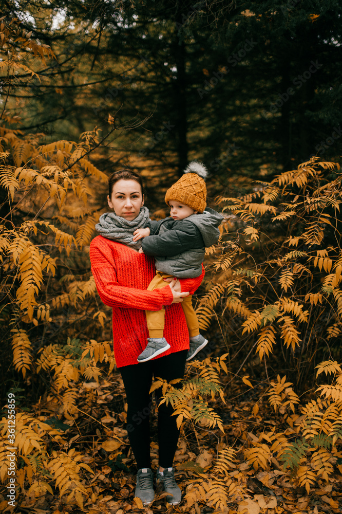 Young beautiful caucasian mother in warm white jacket, black trousers and grey trainers plays with her little son in the autumn park