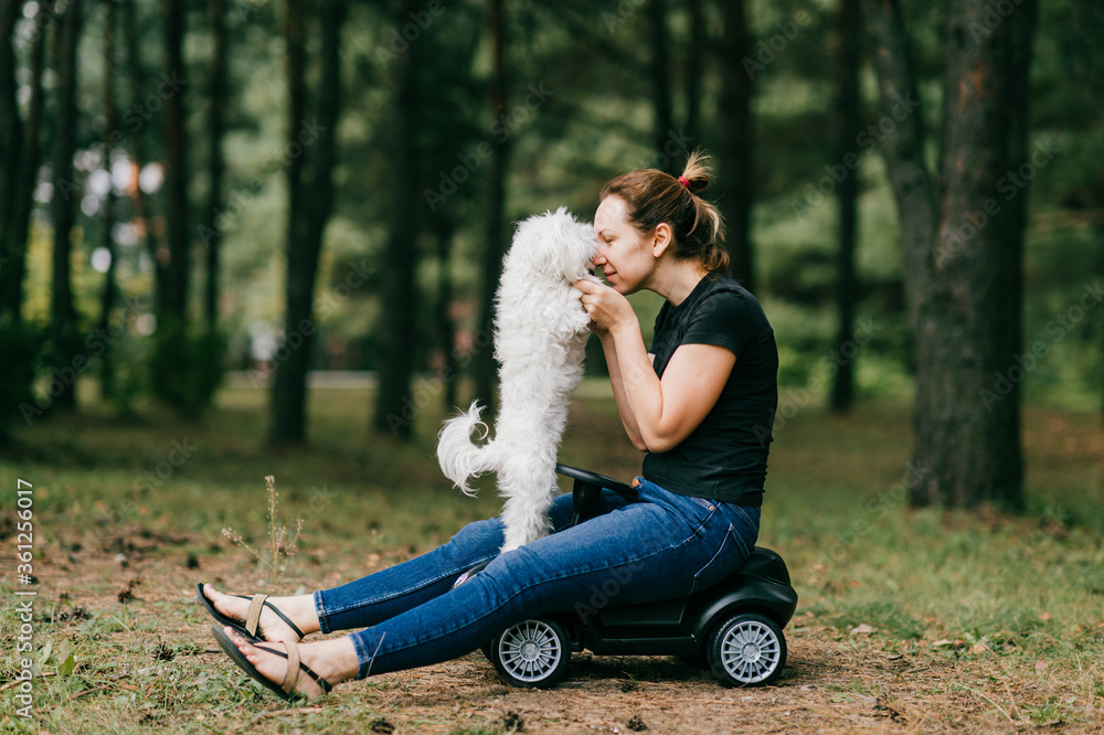 Beautiful caucasian woman with dark hair sits on the little toy car and plays with her little pet dog in the park
