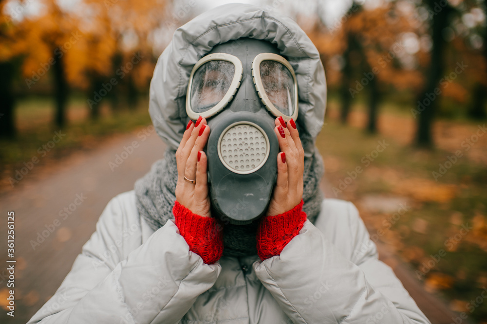 Portrait of strange female in a warm white jacket with a gas mask on her head goes for a walk in the autumn forest