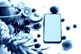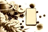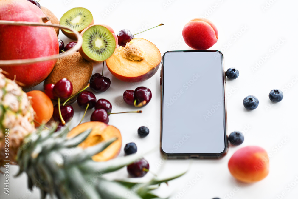 Smartphone surrounded with blueberries, cherry, apricots, pineapple, mango, and kiwi