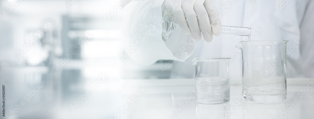 scientist in white coat poring water into glass beaker in medical laboratory science background