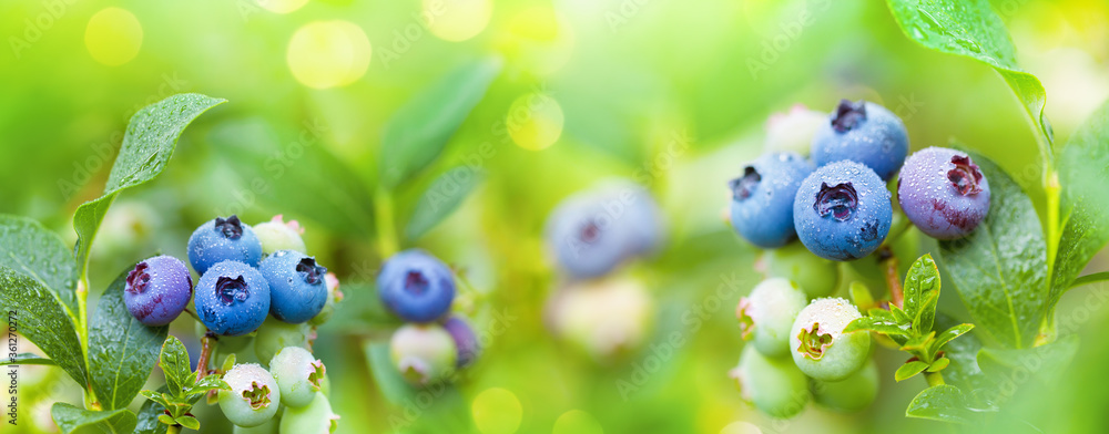 Fresh organic blueberries in raindrops on the bush against nature green background. Gardening concept..