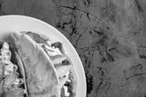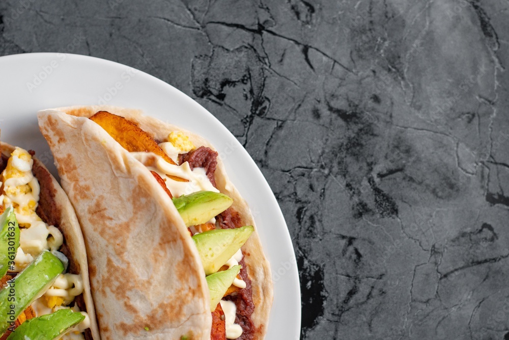 Overhead shot of a white plate with delicious Honduran baleadas on a black textured surface
