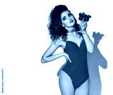 Young rich curly woman in elegant red swimsuit stands holding glass with fresh ripe strawberries in hand