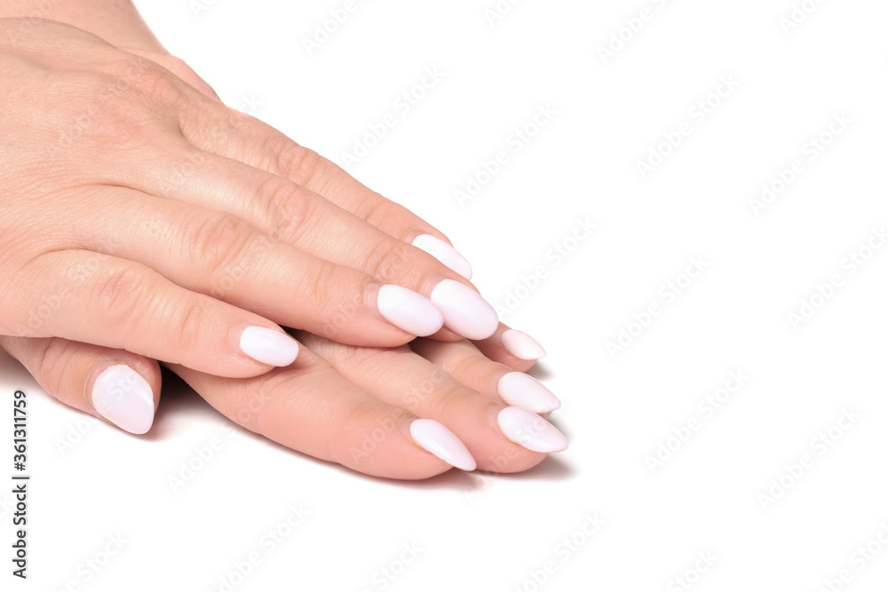 Nails need in correction. Nails care. Time for correction gel polish. Female hands and overgrown gel nails, close up.