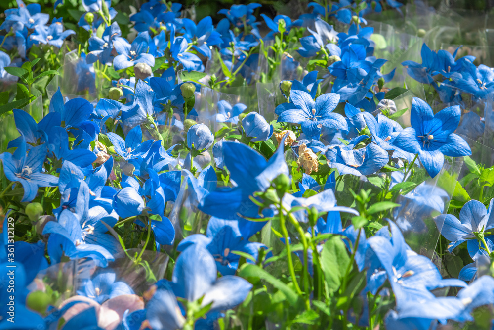 Colorful blue flowers at the entry to flower shop. Many bouquet of blue flowers arranged in the flower shop. Many bouquet flowers.