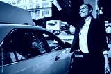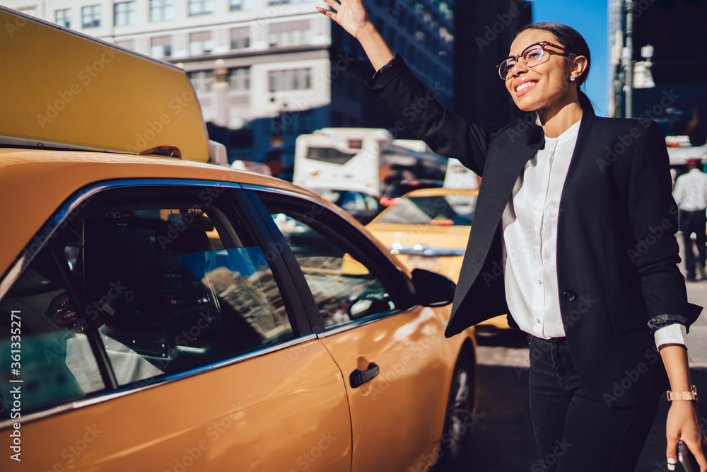 Cheerful afro american executive manager in formal wear catching yellow taxi on work standing in traffic movement.Happy female lawyer in elegant clothes waving hand on street of modern town