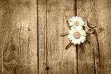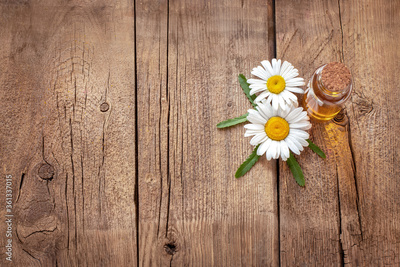 daisies on a wooden background, a bottle with essence, oil or extract of medicinal plants, natural oils, a place for text, advertising, design