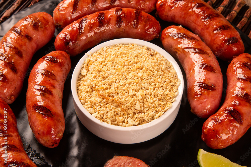 Grilled sausage. Grilled Sausage on wooden board. Brazilian barbecue.