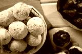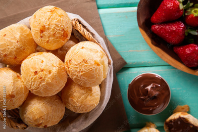 Brazilian snack cheese bread stuffed with chocolate and strawberry fruit on green wood background.