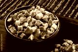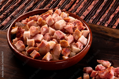 closeup of cubes of bacon on a rustic wooden board. Raw