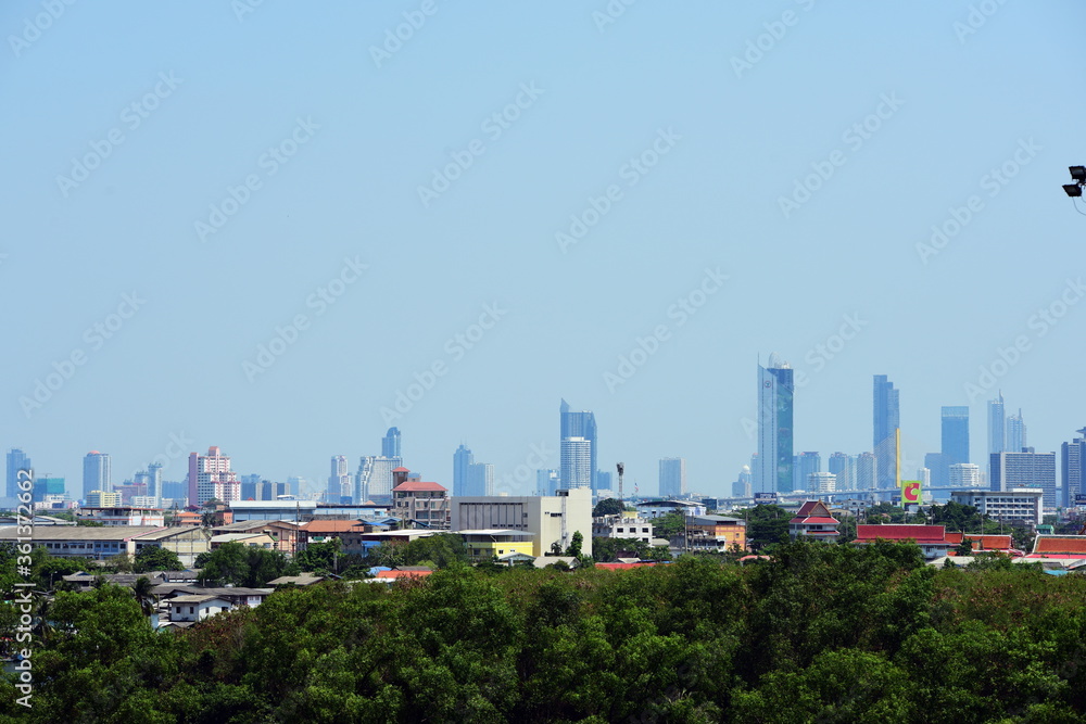 Great city view with beautiful hanging bridges that cross the river of Bangkok, Thailand.