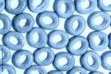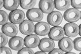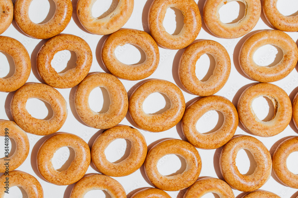 High angle of many palatable brown bagels as kind of fresh bakery and fast food on white background in studio