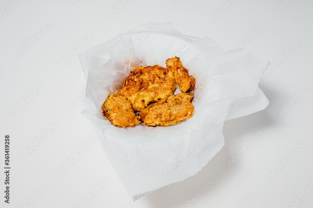 High angle of appetizing roasted chicken in batter on napkin in bowl on white background in studio
