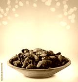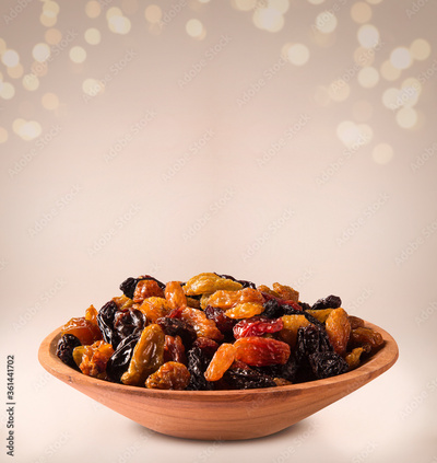 Raisins into a bowl on beige background.