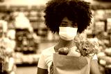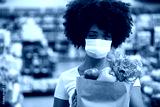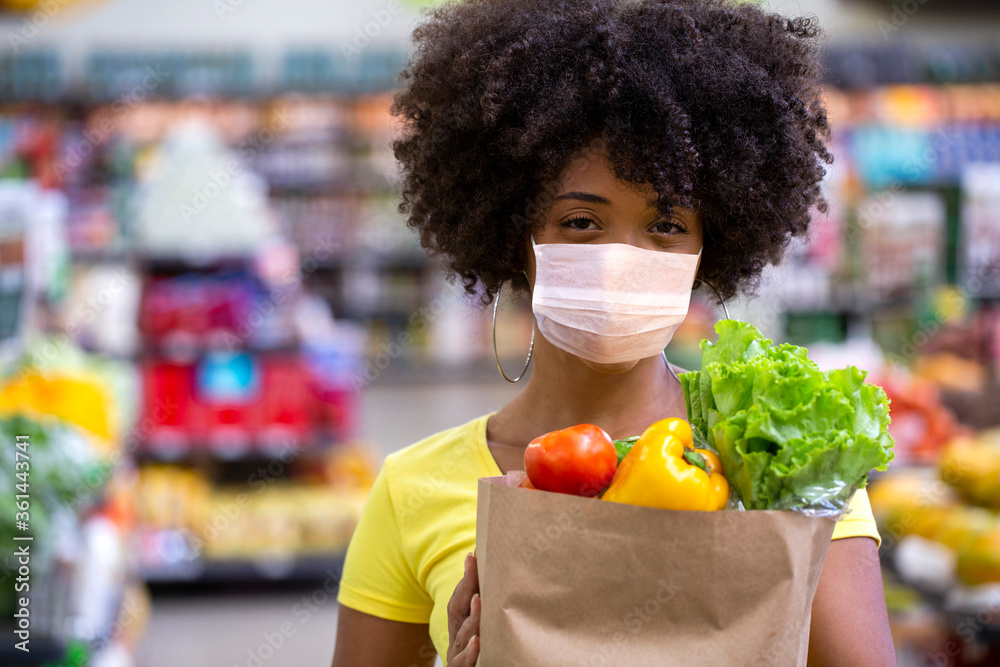 Healthy positive happy african woman using mask, holding a paper shopping bag full of fruit and vegetables