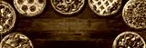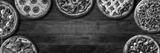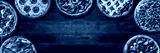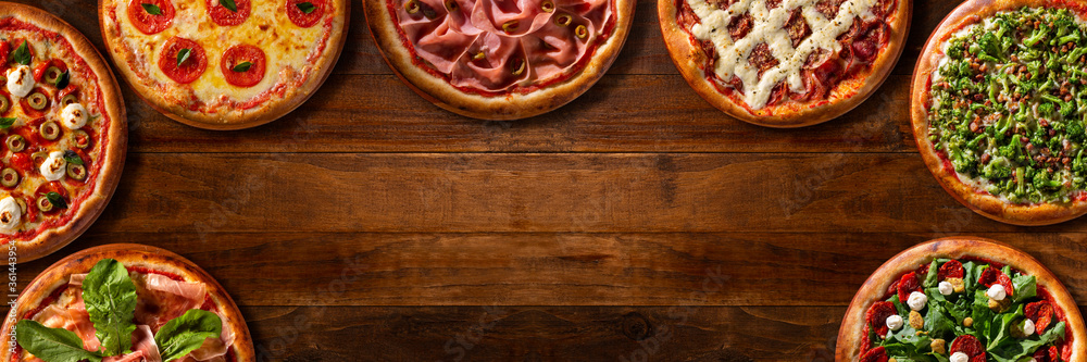 Pizza party dinner. Flat-lay of various kinds of Brazilian pizza over rustic wooden table, top view, wide composition. Fast food lunch, celebration, gathering concept.