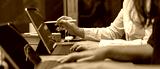 Two female workers consulting on their project while working with mock-up tablet on wooden table