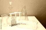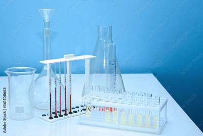 Medical tubes and flasks are located on the table. One flask is broken. Blood collection tubes for analysis
