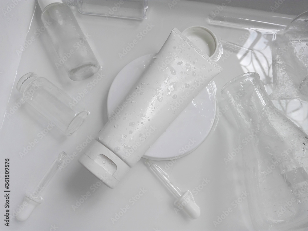beauty treatment medical skincare and cosmetic lotion cream serum oil mockup bottle packaging product on water splash background in healthcare and medicine