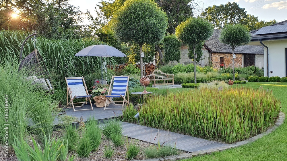 Letni ogród pełen traw, tarasdrewniany w pięknym ogrodzie, parasol przeciwsłoneczny i leżaki w ogrodzie