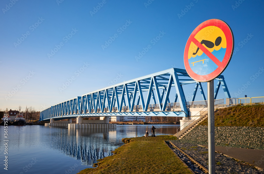 No swimming sign by Odra River in Szczecin sunset, Brdowski Bridge in background, Poland.