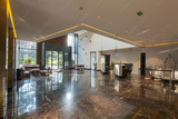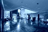Interior of a luxury hotel lobby with marble floor, entrance area