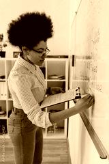 Teaching English language from home. Close up shot of a young afro american female teacher in glasses holding folder with document and writing something on a whiteboard