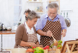 Happy & smiling attractive elderly cute Asian couple in love enjoying cooking healthy salad in kitchen at home together. Happiness family of beautiful romantic married lover or marriage relationship