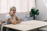 Portrait of carefree young caucasian woman in dreamy emotion at home