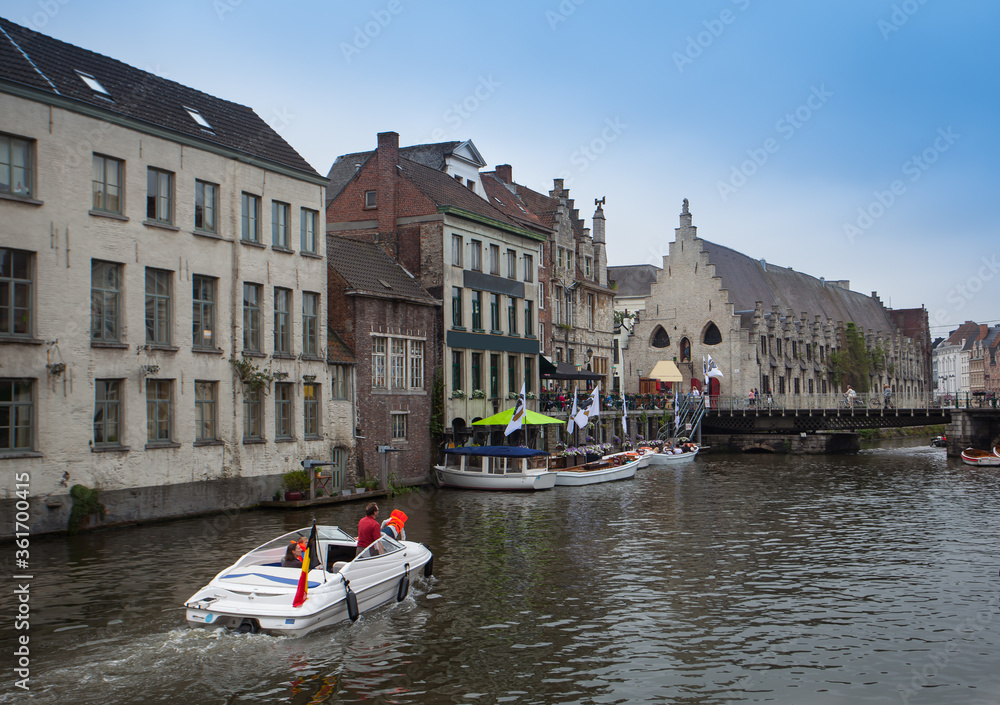 Sightseeing boat on Ghent canal and building architecture and landmark of Ghent Belgium