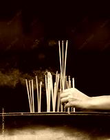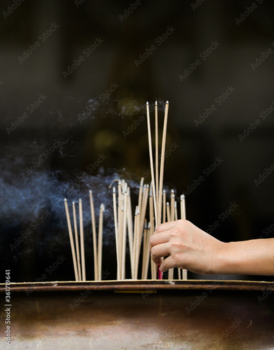 Buddhist placing smoke incense sticks in a pot in the asian temple
