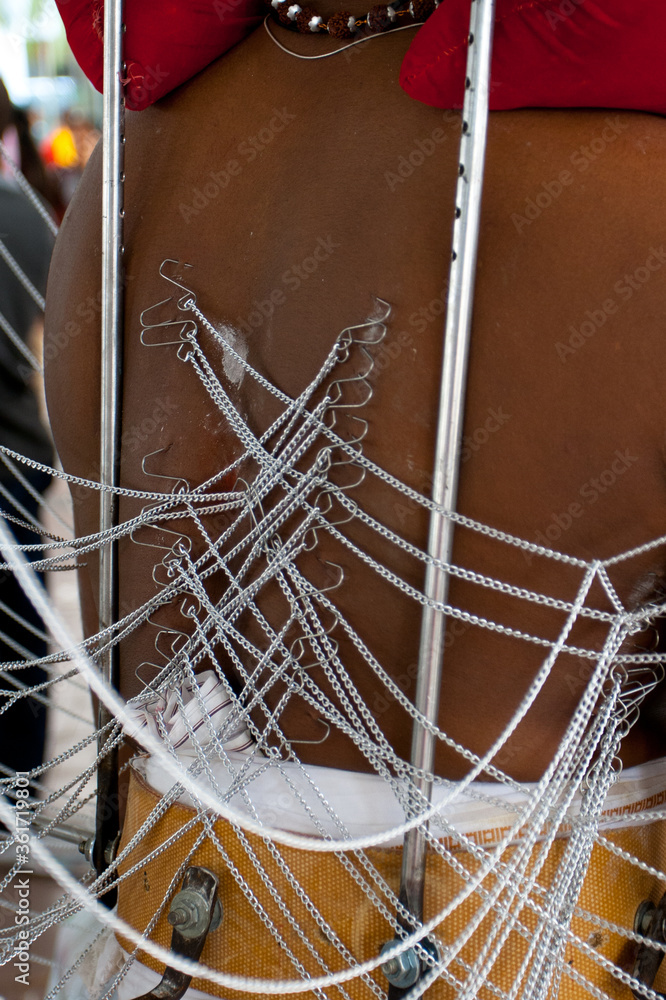 Devotee pierced hooks on the back during the Thaipusam festival at Serangoon Singapore