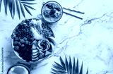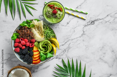 Fresh summer salad with quinoa, peach, micro greens, avocado, berries, coconut, melon on light marble background with tropical leaves. Healthy food, clean eating, Buddha bowl salad, detox, top view