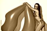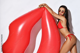Summer vibes. Excited young slim woman in sexy red bikini has fun posing with big inflatable red lips