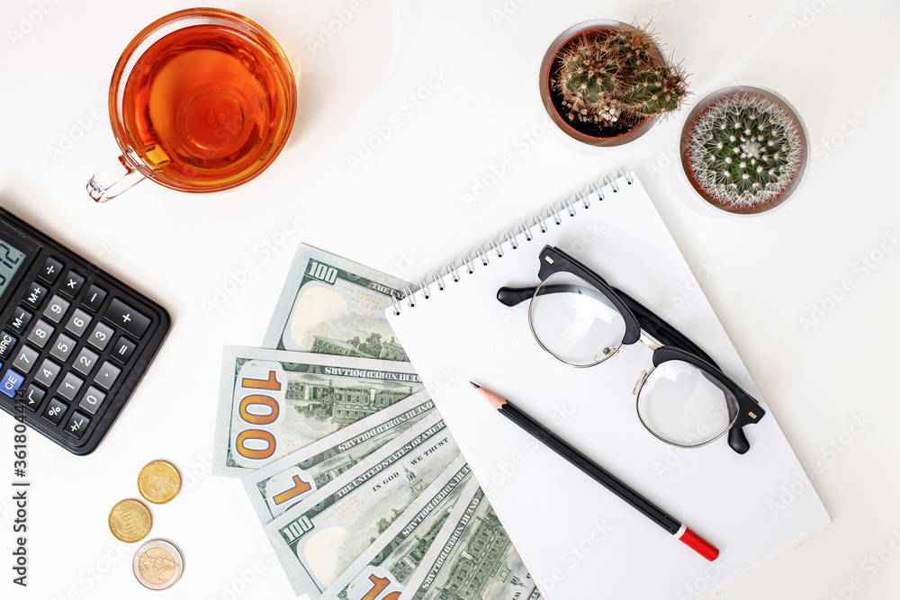 calculator, money and glasses on the table, concept of financial planning of the family budget, payment of bills and loans, summing up
