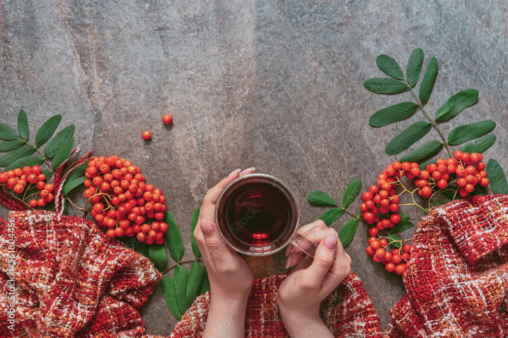 Autumn or winter hot tea with red rowan berries, cozy tea party concept, Illness, flu season, cold concept. Flat lay, top view